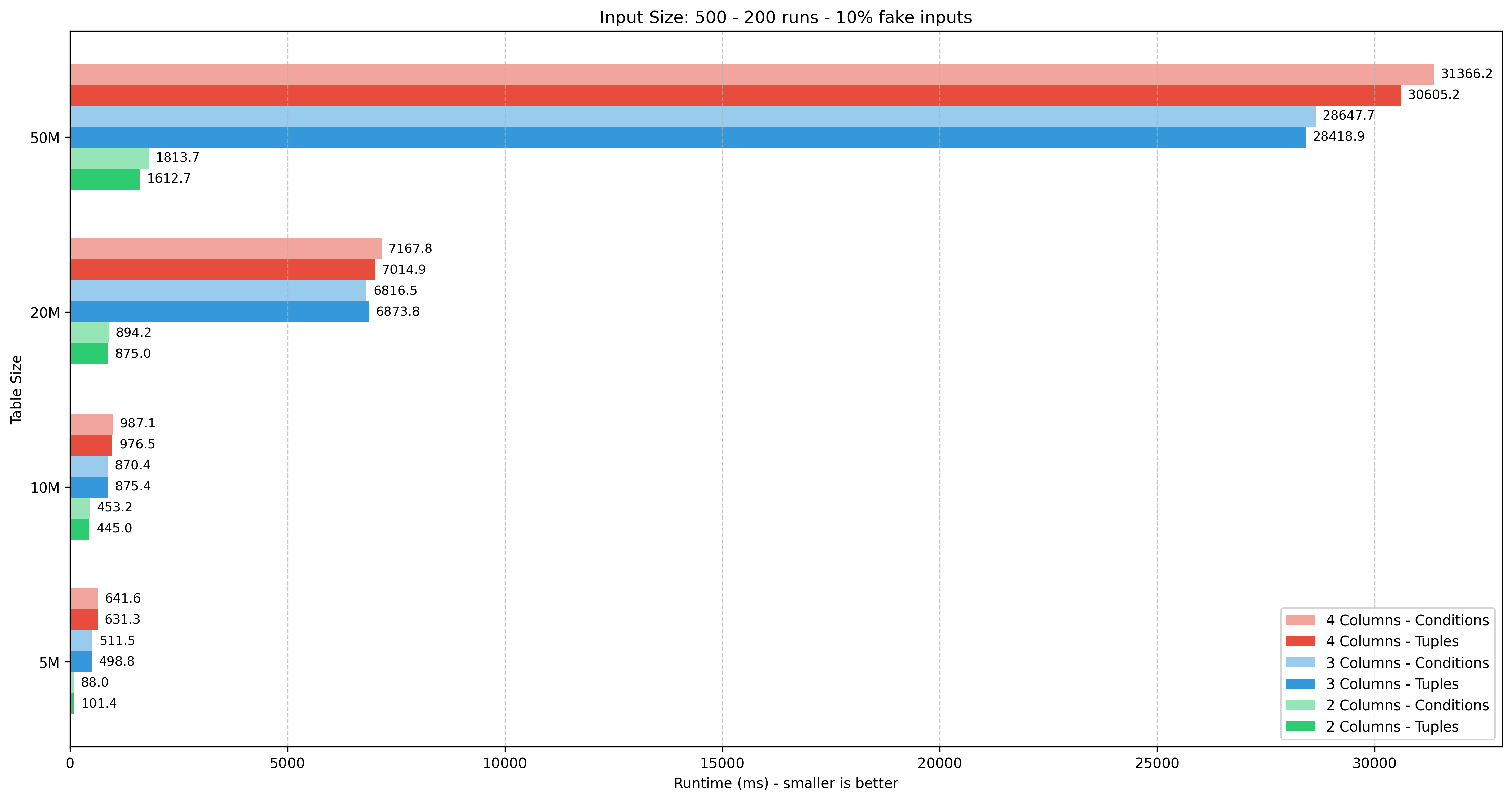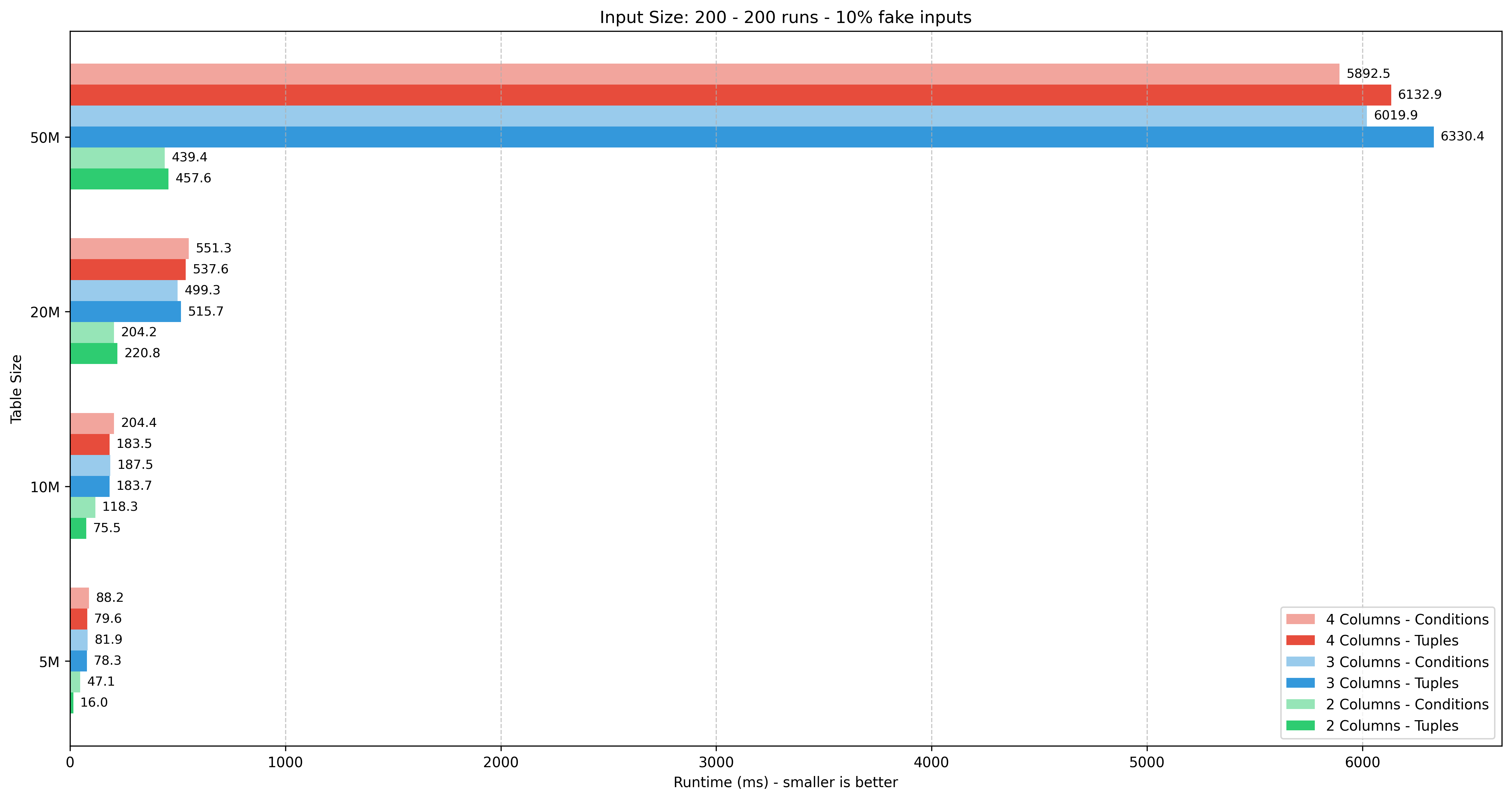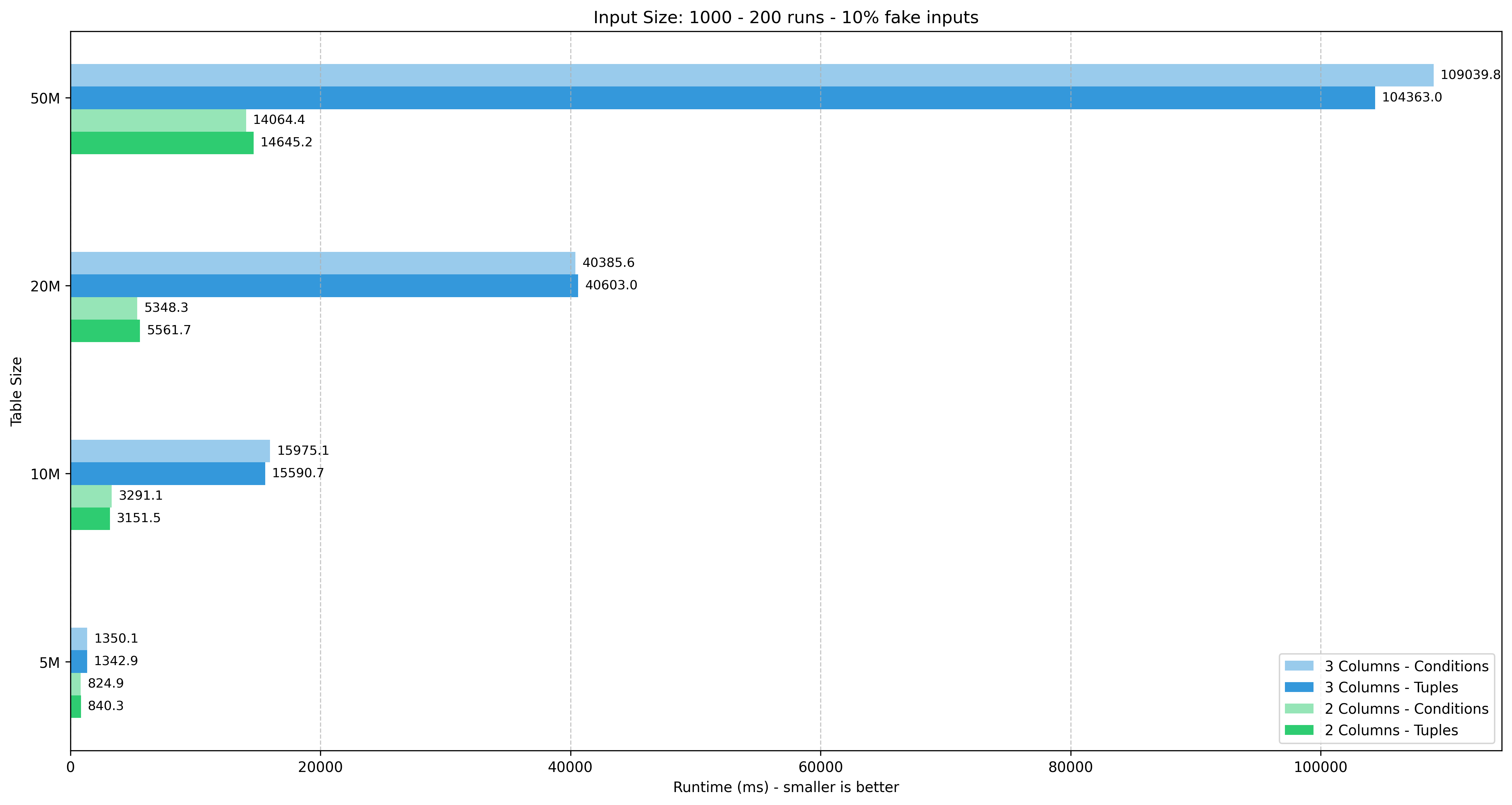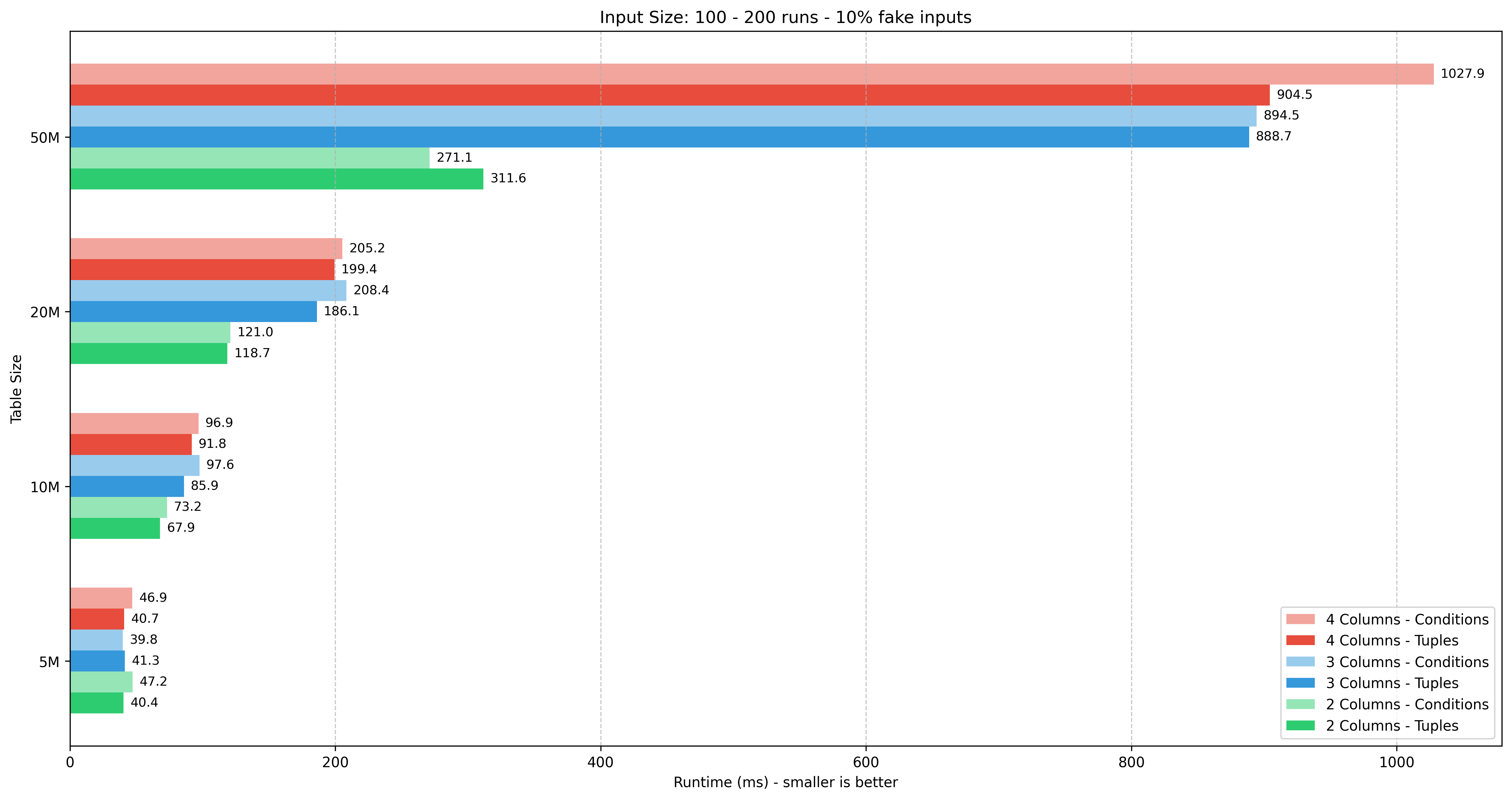 for 30/44 scenarios. However, there were some big anomalies, for example in 200 tuples test cases. - The input size has a big impact on the performance. In the worst case scenario (50M rows), the difference between 100 vs. 200 / 500 / 1000 tuples is 6x / 30x / 100x respectively.